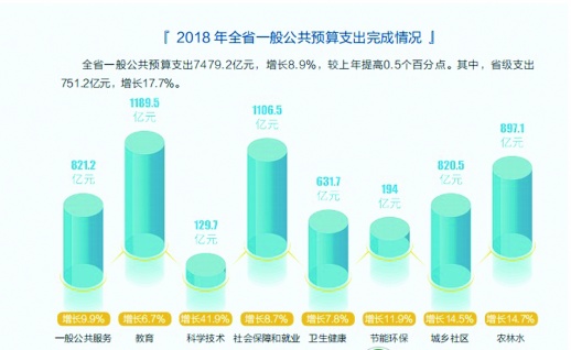 全省一般公共预算支出7479.2亿元,增长8.9%,较上年提高0.5个百分点。聚焦防范化解重大风险、精准脱贫、污染防治、乡村振兴、创新引领开放崛起,多渠道筹集资金,为落实中央和省部署的重点工程、重大项目和重要改革提供了坚实保障。