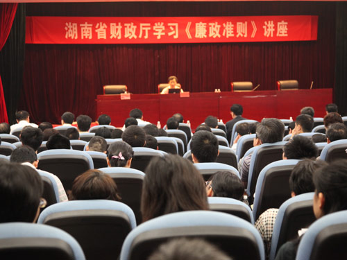 6月3日,湖南省财政厅举办《廉政准则》讲座。省纪委党风廉政室主任叶剑伟同志就《中国共产党党员领导干部廉洁从政若干准则》给全厅干部职工作了生动的报告,讲解了《廉政准则》的地位、作用、主要内容和贯彻实施情况。省财政厅党组成员、纪检组长宋华主持讲座,并对贯彻实施《廉政准则》提出了要求。省长助理、省财政厅厅长李友志同志出席。