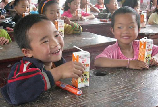 (图为凤凰县大田完小二年级学生喝上免费学生奶)