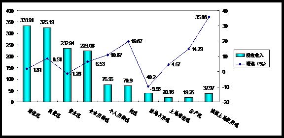 图1:分级次收入结构图 分税种看,流转税(含增值税、营业税、消费税)收入892.04亿元,增长3.41%;所得税(含企业所得税、个人所得税)收入300.04亿元,增长7.58%;财产税(含城镇土地使用税、房产税、车船税、印花税)收入56.87亿元,增长21.47%;行为税(含契税、土地增值税、耕地占用税、城市维护建设税)收入208.85亿元,增长9.60%;其他税收收入(资源税,烟叶税等,不含上划中央其他收入)8.59亿元,增长23.42%。 图2:分税种收入结构图(收入规模及比重) (二)税收增长的总体特点。 1、税收增速逐月下降,且大大低于2013年同期增速。2014年以来,全省税收月度增速总体呈现下滑态势。除2月份小幅回升外,其他月份逐月下滑,由1月份的9.3%逐月下降到6.0%。与2013年同期比较,2014年1-6月月度收入增速回落明显,往年受征管因素的影响,6月份当月增速往往会有所回升,但今年6月份增速继续走低,值得引起关注。 图3:近两年上半年月度税收收入增长趋势图 2、各税种收入增速不均衡,小税种增长快于主体税种。1-6月,全省城镇土地使用税、车船税、城市维护建设税、契税和资源税等小税种分别增长35.88%、20.86% 、19.87%、17.59%和16.92%;而同期增值税、消费税、营业税和企业所得税分别增长1.81%(剔除营改增收入为-3.6%)、8.51%、-1.28%和6.53%。 3、房地产税收增速放缓,但对税收增长的贡献度有所提高。1-6月,我省房地产相关行业实现税收收入同比增长15.47%,高于全省税收收入平均增幅9.47个百分点,但远低于去年同期房地产税收29.54%的增幅;房地产相关行业税收增收占全省税收增收83.22亿元的比例为58.53%,贡献度比去年同期提高13个百分点。 (三)税收增长的主要影响因素分析。 1-6月,湖南省税收收入增速明显下滑,增速同比大幅回落,概括起来主要有以下几个方面的原因: 1、工业、投资等经济增长的主要动力减弱,主要经济指标增速和物价涨幅继续放缓。一是工业经济主要指标增速放缓。上半年,全省工业经济虽保持平稳运行,规模工业增加值增长11%,同比加快0.7个百分点;但固定资产投资同比增长21.2%,增速回落4.9个百分点;全社会用电量增长2.6%,比1-5月回落1.1个百分点,连续4个月下降;1-5月,全省规模工业企业盈亏相抵后实现利润总额504.60亿元,同比增长4.0%,增幅较一季度下滑了13.9个百分点,比上年同期低2.6个百分点。二是社会消费平稳回升,但同比仍有所回落。上半年,全省社会消费品零售总额4638.44亿元,同比增长12.9%,增速比1-5月高0.1个百分点,但比去年同期略下降0.2个百分点。三是物价涨幅持续走低。居民消费价格涨幅同比小幅回落。全省居民消费价格同比上涨2.3%,涨幅比上年同期回落0.1个百分点;工业生产者价格持续下降、降幅收窄。全省工业生产者出厂价格同比下降1.6%。其中,生产资料价格下降2.2%,生活资料上涨0.6%,从4月份开始降幅逐月收窄。工业生产者购进价格同比下降2.0%,1-6月工业生产者购进价格与出厂价格走势趋同。 2、房地产市场降温,相关税收增长相应减速。去年同期,房地产业逆势爆发,房地产税收增长出现井喷,导致基数较高。今年以来,房地产市场遇冷,相关税收增长明显放缓。一是商品房销售量价齐跌。1-6月,全省商品房销售面积下降9.4%,降幅比1-5月扩大1.4个百分点,同比回落了33.2个百分点;商品房销售额下降10.3%,降幅比1-5月扩大1.3个百分点,同比回落了43.6个百分点。二是房地产开发投资回落。全省房地产开发投资增长10.8%,同比回落8.7个百分点;商品房施工面积同比增长14.6%,增幅与1-5月持平;商品房新开工面积下降15.3%,2月以来持续下降,但降幅比1-5月收窄4.9个百分点。相关税收增长也受到拖累,加之去年同期因房地产调控“国五条”出台导致房屋转让税收基数较高,致使今年1-6月全省房屋转让个人所得税增速由去年同期的256.06%下降到-33.99%,不动产销售营业税增幅下滑26.6个百分点,土地增值税增速回落16.57个百分点,契税回落34.41个百分点。 3、支柱税源税收增速下降明显,导致主体税种增速明显放缓或出现负增长。1-6月,我省烟草制造业、成品油、煤炭、专用设备制造业、有色金属等支柱税源行业国内增值税、消费税和企业所得税(以下简称“三税”)增速下降较为明显。其中,湖南中烟公司入库340.93亿元,同比增长11.27%,增速同比回落21.6个百分点;省内主要成品油生产企业 “三税”减收19.31亿元,同比下降37.98%;煤炭开采业入库税收7.36亿元,同比下降15.42%;专用设备制造业入库16.45亿元,同比下降29.11%;有色金属矿采选业入库5.84亿元,下降14.62%。受此影响,工商业营业税下降1.28%,增值税仅增长1.81%(剔除营改增收入下降3.6%)。 4、政策性减税因素较多,由此带来的税收减收效应较为明显。(1)营改增试点减税较多。营改增试点有力地减轻了试点企业及下游企业的税收负担。与缴纳营业税相比,1-6月,我省试点纳税人税收减少12.22亿元,原一般纳税人新增可抵扣进项税额6.51亿元,合计共减少税收18.73亿元。(2)小微企业暂免征收营业税、增值税。从去年8月1日起,国家决定暂免征收月营业额在2万元以下的小微企业的增值税和营业税。2014年1-6月,全省16.9万户小微企业免征增值税约1.26亿元。(3)企业所得税优惠政策。今年1月1日起执行的小型微利企业所得税优惠政策、企业年金和职业年金个人所得税等税收优惠政策对税收的增长也有一定的负面影响。从今年1月1日起,小微企业所得额由6万元以下减半征收