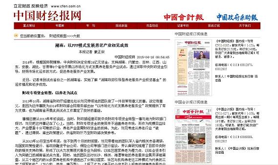 4-5月,中国财经报以《湖南:以PPP模式发展养老产业初见成效》为题,中央电视台新闻频道以“湖南率先建立养老产业基金”为题作了报道,人民日报、新华社也先后相继推出了有关报道,为我省推进健康养老服务产业基金试点营造了良好的舆论氛围。