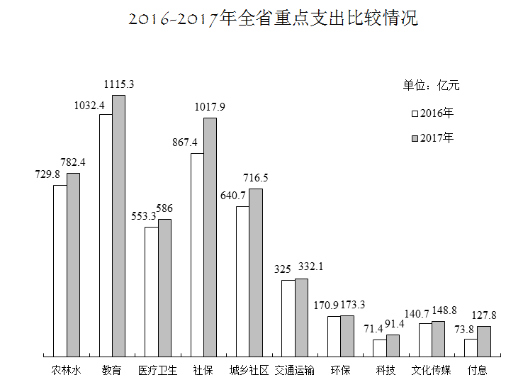 8%;科学技术支出91.4亿元,增长28%;文化体育与传媒支出148.8亿元,增长5.8%;社会保障和就业支出1017.9亿元,增长17.4%;医疗卫生与计划生育支出586亿元,增长5.9%;节能环保支出173.3亿元,增长1.4%,主要是中央专项补助减少;城乡社区支出716.5亿元,增长11.8%;农林水支出782.4亿元,增长7.2%;交通运输支出332.1亿元,增长2.2%,主要是中央调整了部分交通运输补助政策,专项补助增量较少;债务付息支出127.8亿元,增长73.2%,主要是存量债务置换进程加快,新增债券规模逐年扩大,利息支出相应增加。
