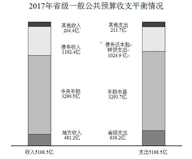 省级一般公共预算总收入1002亿元,为年初预算的101%,增长10.2%,其中,地方收入481.2亿元,增长17.3%;上划中央收入520.8亿元,增长4.4%。从平衡情况来看,省级地方收入481.2亿元,加上中央补助3290.5亿元,市县上解62.3亿元,一般债务收入1192.4亿元,调入预算稳定调节基金35亿元,调入资金18.3亿元,上年结转88.8亿元,可安排使用的收入合计5168.5亿元。省级一般公共预算支出638.2亿元,为调整预算(省十二届人大常委会第三十次会议审议通过)的105.2%,主要是年度预算执行中,中央下达部分专项转移支付列省级支出,加上上解中央支出35.2亿元,补助市县支出3293.7亿元,一般债务还本支出143.6亿元,一般债务转贷支出881.3亿元,补充预算稳定调节基金48.1亿元,结转下年支出128.4亿元,支出合计5168.5亿元,收支平衡。